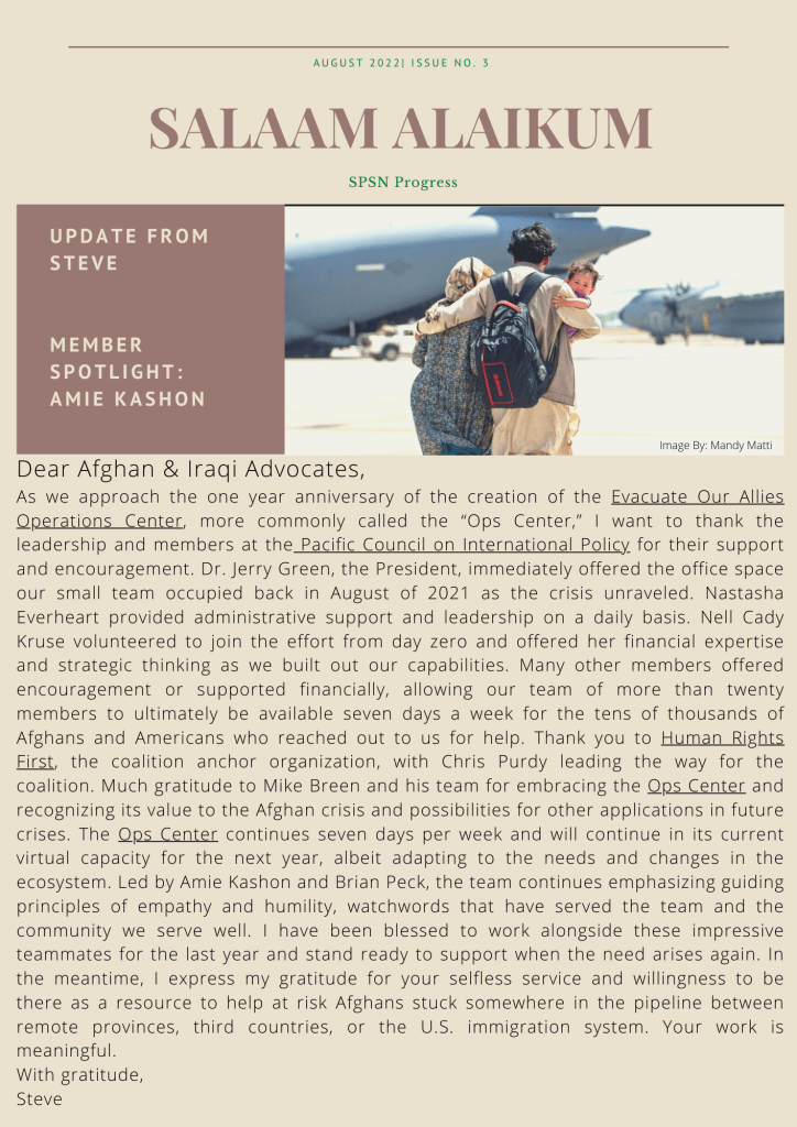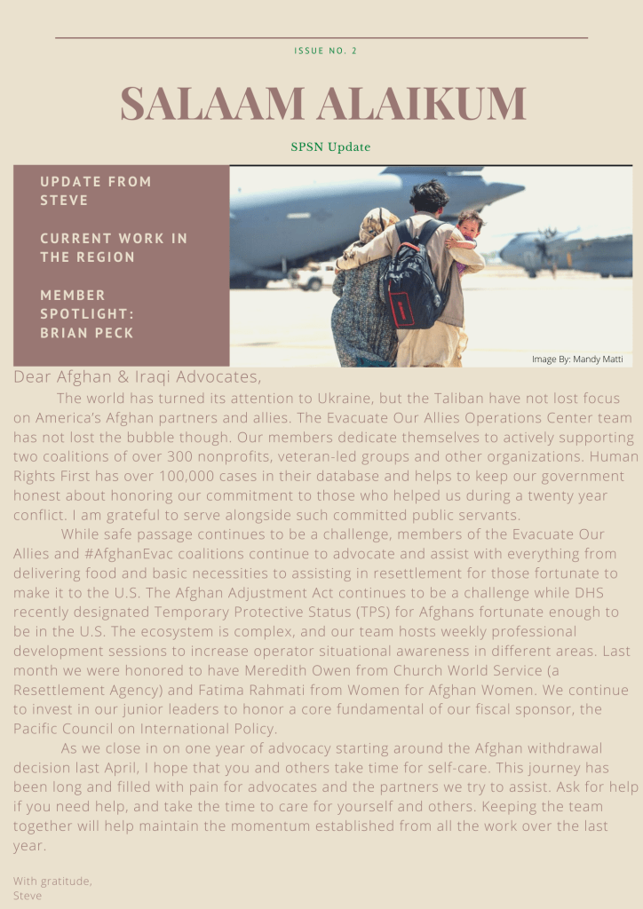 I continue to be humbled as people join the effort to stand for our values as Americans by protecting our Iraqi, Afghan, and other colleagues around the world who have supported our efforts. For example, Jure Erlic continues to volunteer for the SPSN project while studying and teaching as a grad student at Carnegie Mellon University. The International Refugee Assistance Project (IRAP) just had a big win in a case that is at the center of a lawsuit. Read more about the case below. Pete Farley, a veteran trying to bring his interpreter’s family to the U.S. has over 136K signatures on a Change.org petition, and there are many other instances of people standing up. Most recently, I continue to get asked to help with vulnerable asylum cases where sending individuals who supported our national security back to their country of origin would mean almost certain death. People reach out in need more and more. I don’t see this trend abating in the near term or even over the long run. We need to do better to protect our soft networks as a country. The research and policy development options that SPSN has created offer a path forward. If you haven’t read the white paper we produced this year, click on the link here.