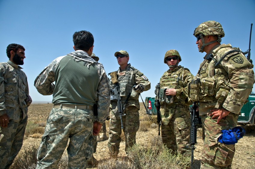 U.S. Air Force Capt., Matthew Zahler, and Major Jason Helton, air mobility liaison officer, uses a translator to talk to Afghan border police about the best location to establish a drop zone near their remote compound in southern afghanistan. Capt. Zahler relies on local knowledge of the area in order to avoid establishing the drop zone on old mine fields and areas used by Taliban fighters. U.S. Air Force Photo/Master Sgt. Jeffrey Allen